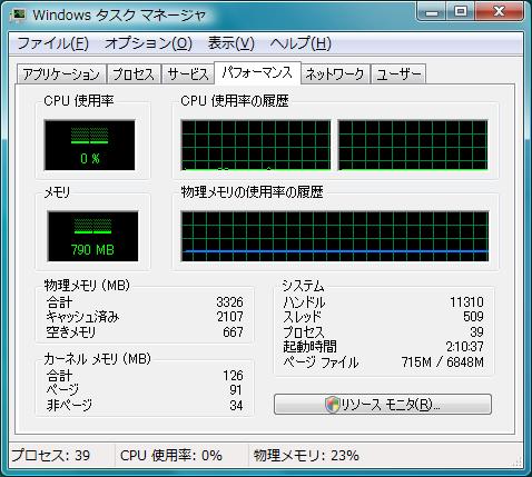 CPU使用率は40〜45%です。GeForce8400GS搭載PCよりCPU使用率が高いとはいえ、オンボードVGAでもコマ落ちしないのは立派。