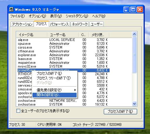 Prime95.exeを右クリックで「関係の設定」を選択。