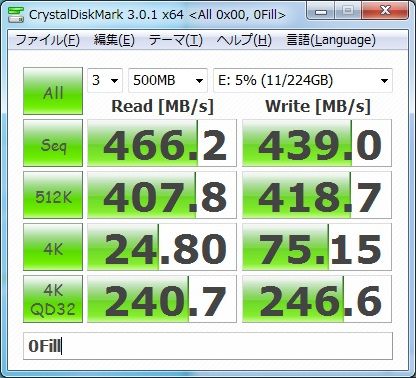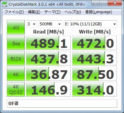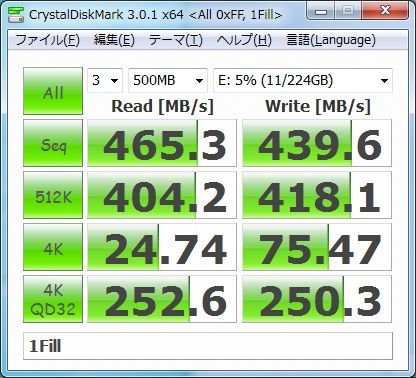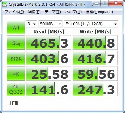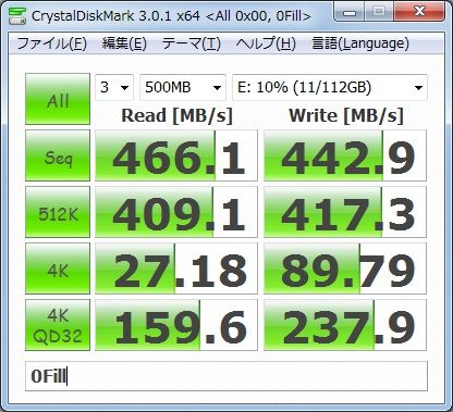 ご覧の通り、CrystalDiskMarkでは、デフォルト設定と0/1 FillのWriteで大差がついています。