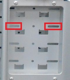 HDD固定時のネジ穴は赤枠の溝部分です。